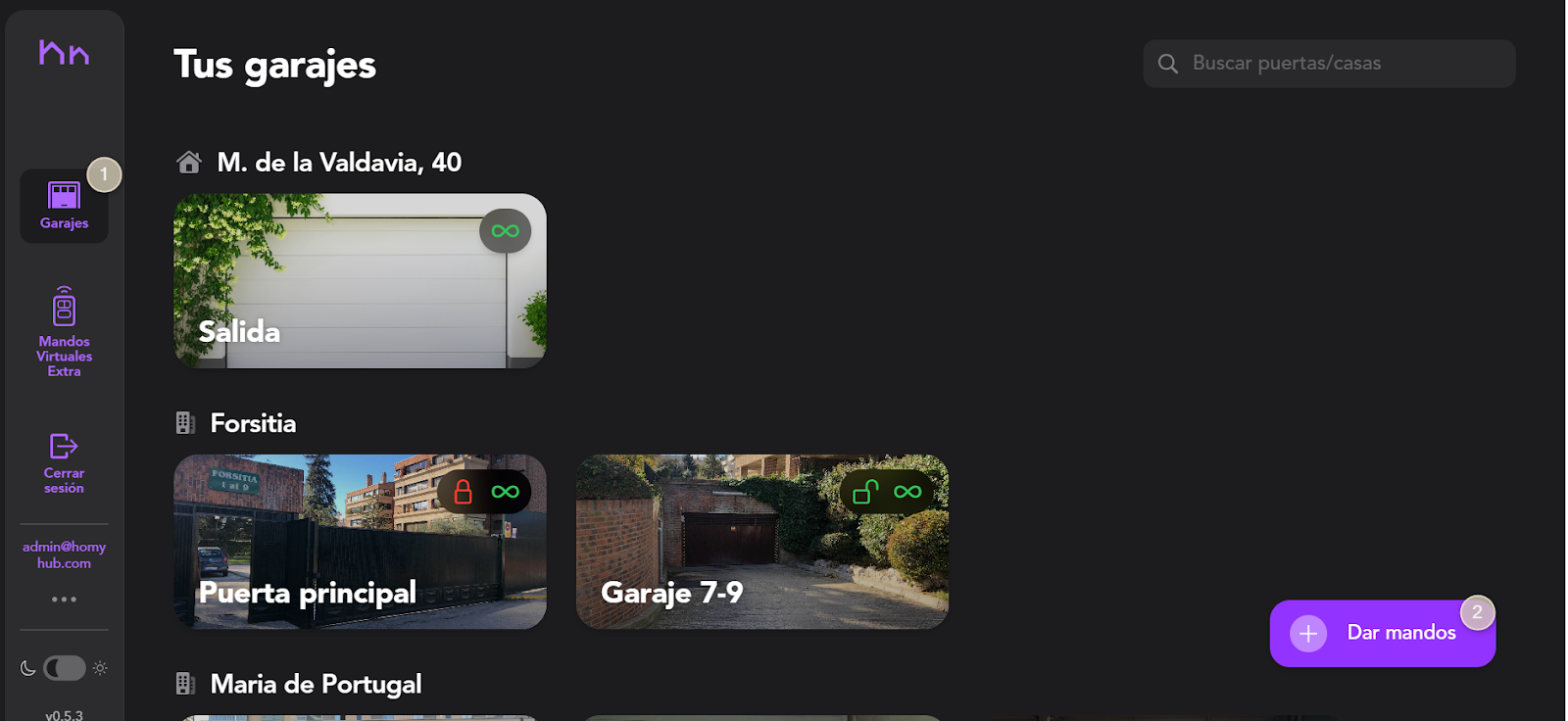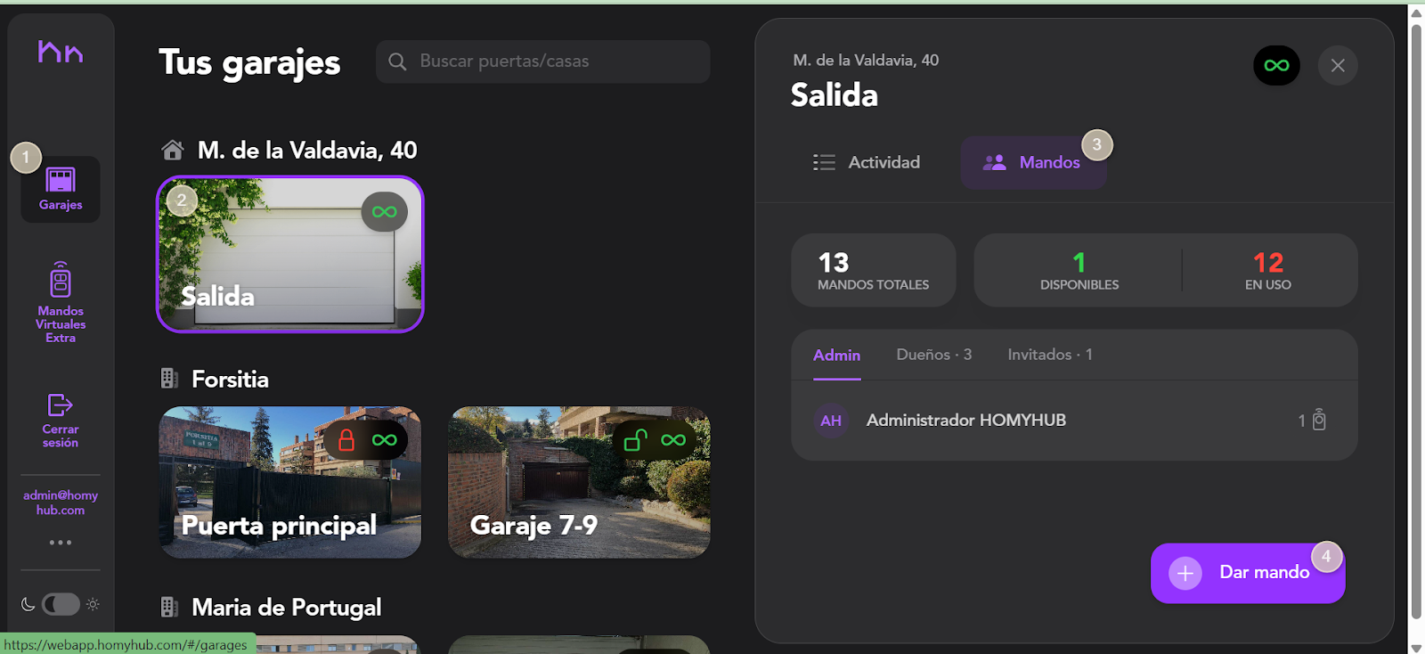 1.- Desde “Tus garajes”, selecciona la puerta > Mandos > Dar mando: