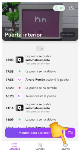 Para poder sacar todo el potencial de nuestra App, tienes que ir a la sección de "Detalle" de tu puerta. Desde allí tendrás las 3 sub-secciones: Actividad, Mandos (para compartir mandos virtuales de forma fácil, personalizada y segura con quien necesites) y Ajustes.