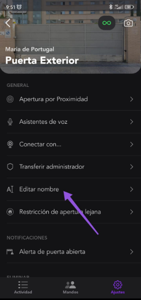 Si eres administrador de los dispositivos HOMYHUB, puedes editar el nombre de tus puertas en la App desde: Ajustes de la puerta > Editar nombre: