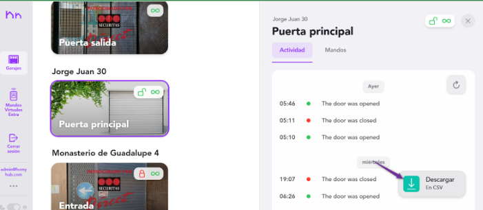 Para ello, solo debes ingresar a la webapp con las mismas credenciales usas en la App móvil > Selecciona tu puerta > Y pulsa en el botón “Descargar en CSV”: