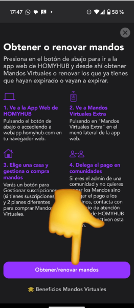 Para renovar la suscripción de los Mandos Virtuales, desde la pantalla principal de la App selecciona el ícono de los 3 puntos > + Instalar > Mando Virtual Extra > Obtener/renovar mandos.