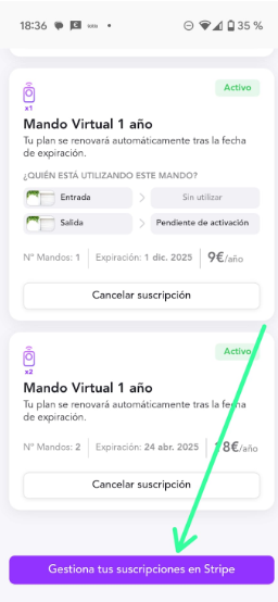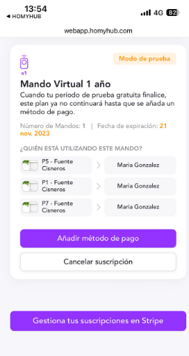 A continuación, podrás visualizar las suscripciones de mandos que tienes. Nota que cada suscripción indica las puertas y la persona que está usando el mando.