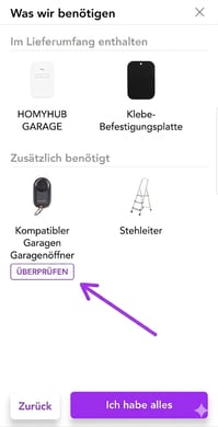 Wenn Sie sich nicht sicher sind, können Sie jederzeit versuchen, es zu installieren. Unser In-App-Setup-Assistent teilt Ihnen mit, ob es kompatibel ist und ob das HOMYHUB GARAGE-Gerät es kopieren konnte oder nicht.