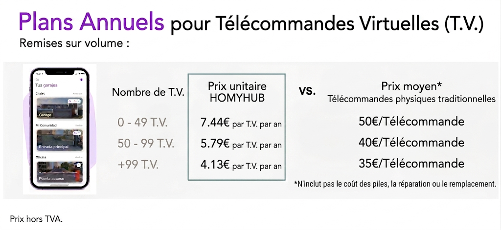 Grâce à l'application HOMYHUB, gérez facilement et en toute sécurité l'accès d'un nombre illimité d'utilisateurs grâce à nos télécommandes virtuelles. Un kit de démarrage vous permet de contrôler jusqu'à deux portes, chacune incluant cinq télécommandes virtuelles gratuites à vie. Besoin de plus de télécommandes virtuelles ? Achetez-en autant que vous le souhaitez, moyennant un abonnement annuel de 5 € à 9 €, selon la quantité achetée.