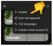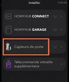 1- Edans le menu principal de l'application (icône à trois points dans le coin supérieur droit)Sélectionnez « + Installer », vous y trouverez l'assistant d'installation pour les appareils HOMYHUB et leurs accessoires.