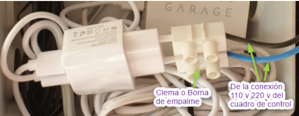 Pero si que se puede (realizado por profesional electricista), tomar de la alimentación de 110 V o 220 V del mismo cuadro de maniobra y haciendo un empalme para conectar (con una clema de empalme) un cargador o alimentador de móvil de 5V con puerto USB y de allí alimentar al HOMYHUB GARAGE con cualquier cable USB a Micro USB en su puerto lateral.