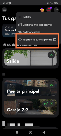 Pode aumentar o tamanho dos seus cartões de garagem a partir do ícone com três pontos no ecrã principal da App > Cartões de porta grandes.