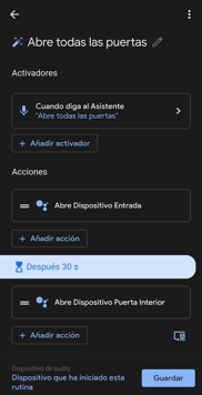 1.- Crie uma rotina do Google que lhe permitirá abrir quantas portas quiser simultaneamente e até mesmo criar um atraso na abertura entre as portas, se necessário, ou seja, quando pedir ao assistente para «abrir todas as minhas portas», ele abrirá a primeira e, após «X» segundos, a seguinte.