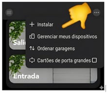 1- No menu do ecrã principal da aplicação (ícone de três pontos no canto superior direito), selecione «+ Instalar», onde se encontra o assistente de instalação dos dispositivos HOMYHUB e seus acessórios.