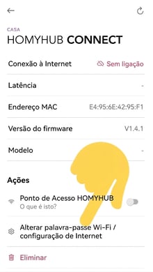 B.2.- Se a fonte de Internet estiver correta, tente reconfigurar a ligação à Internet do seu HOMYHUB CONNECT que você administra. Para isso, na secção «Gerir os meus dispositivos», selecione o seu HOMYHUB CONNECT e, em seguida, a opção «Alterar senha WiFi/Configuração da Internet».