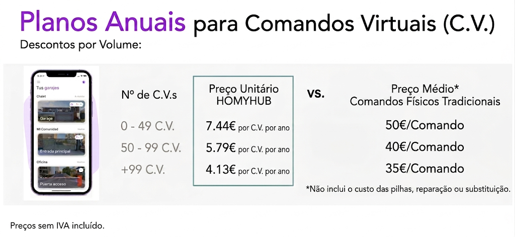 Com a compra de 1 Starter Kit, poderá controlar até 2 portas e, em cada uma delas, terá 5 Comandos Virtuais gratuitos para toda a vida. Se precisar de mais Comandos Virtuais, pode comprar quantos Comandos Virtuais Extra desejar, cada um com uma anuidade de 9 a 5 euros por ano, dependendo da quantidade que comprar anualmente.