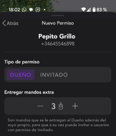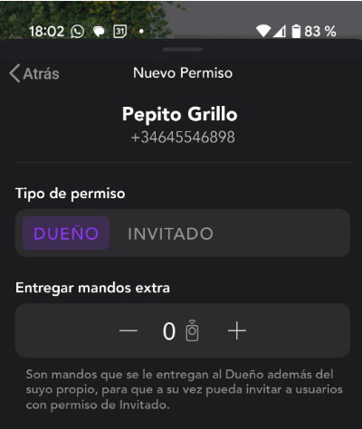 Se trata de que has asignado un mando virtual a esa persona con el rol de dueño. Este rol permite no solo el acceso a la puerta a través de su mando, sino también la gestión de mandos virtuales adicionales.